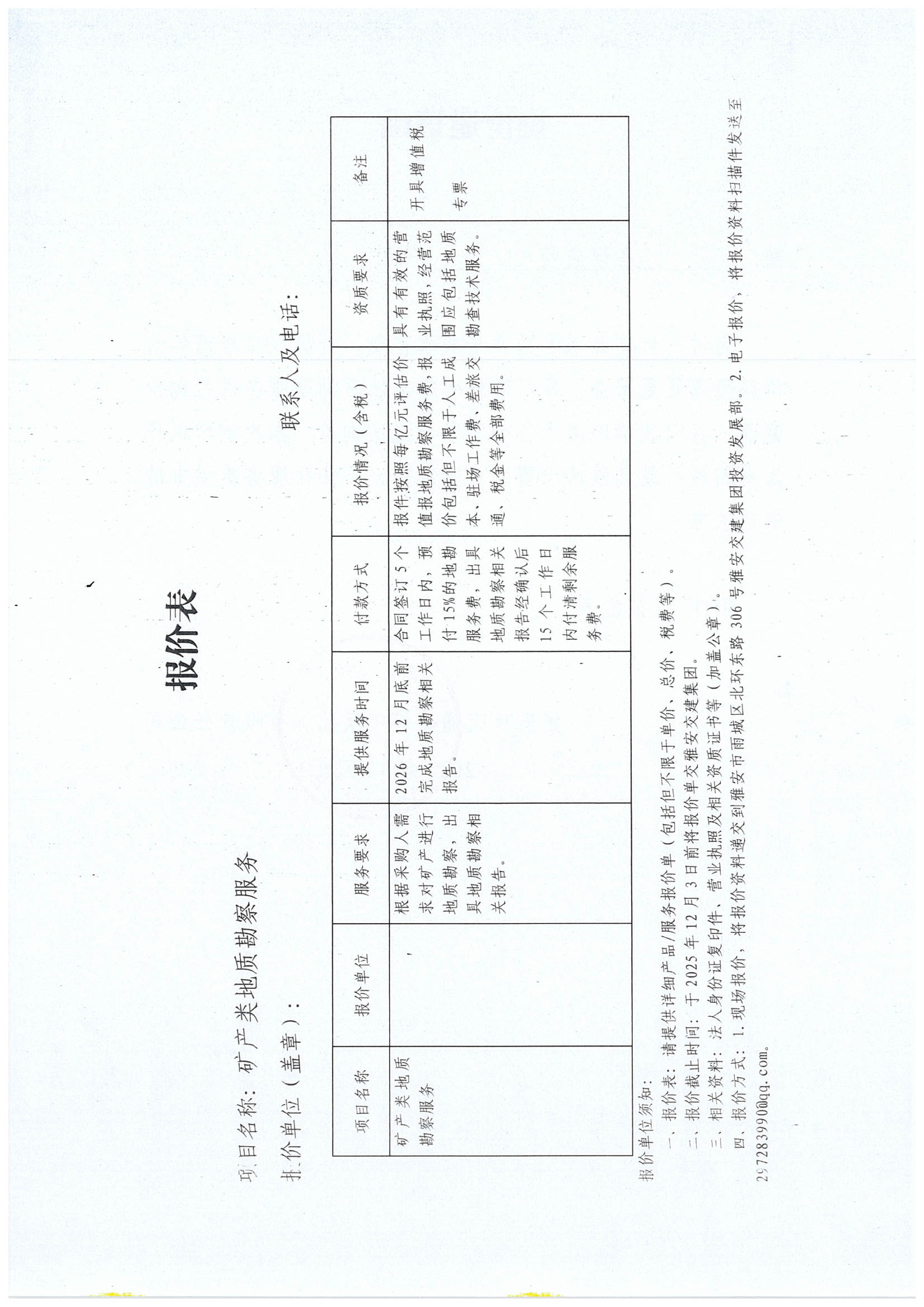 關(guān)于雅安市交通建設(shè)(集團(tuán))有限責(zé)任公司礦產(chǎn)類(lèi)地質(zhì)勘察服務(wù)限價(jià)的詢價(jià)函