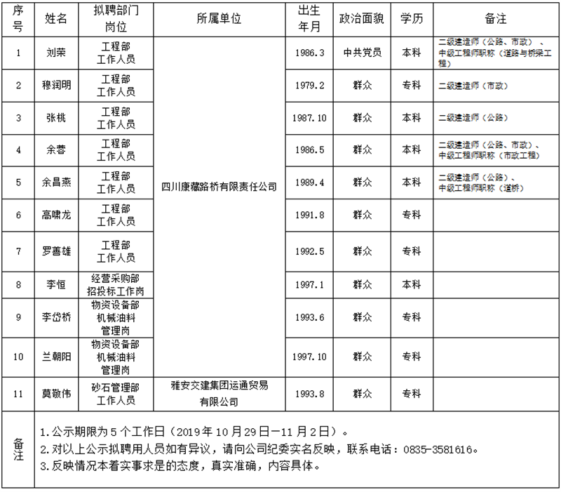 根據(jù)集團(tuán)公司《人才選聘實(shí)施辦法》,通過(guò)公告報(bào)名、資格審查、綜合測(cè)試等各項(xiàng)招聘程序,現(xiàn)對(duì)以下擬聘用人員予以公示: