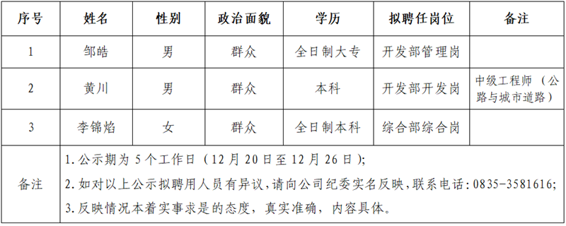 根據(jù)雅安交建集團大興交通開發(fā)有限公司招聘公告,經(jīng)公開報名、資格審查、筆試、面試等環(huán)節(jié),現(xiàn)將以下3名擬聘用人員予以公示: