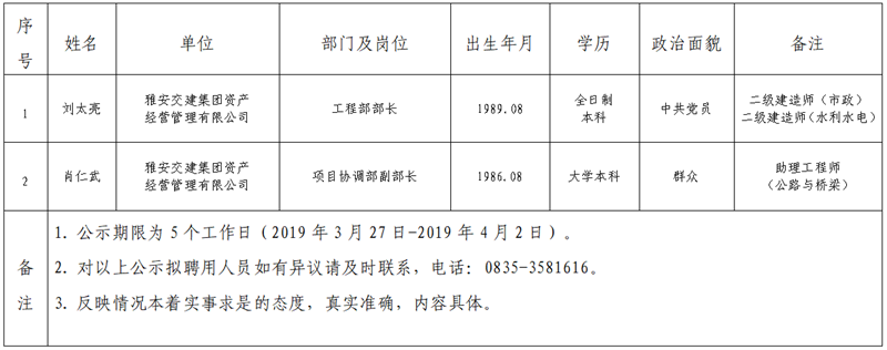 雅安交建集團子公司擬聘用人員公示(資產(chǎn)經(jīng)營管理公司)