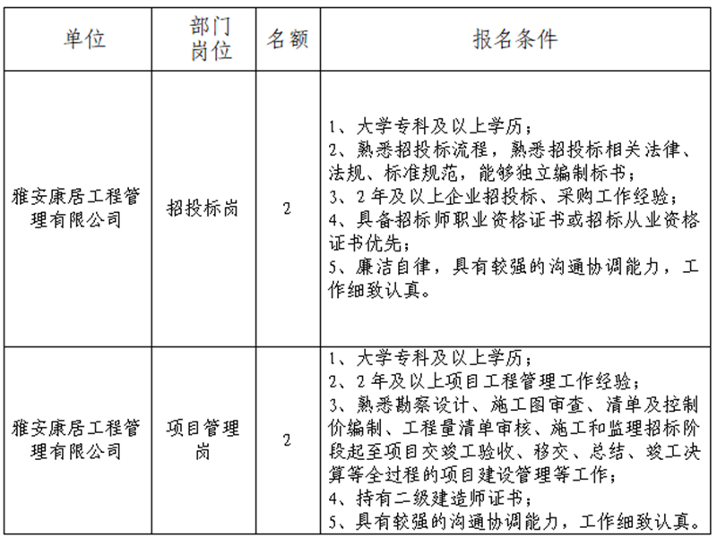 根據(jù)發(fā)展需要,決定面向社會(huì)公開招聘雅安市交通建設(shè)(集團(tuán))有限責(zé)任公司(以下簡稱“雅安交建集團(tuán)”)所屬子公司工作人員4名,現(xiàn)將有關(guān)事項(xiàng)公告如下: