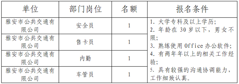 1、報名。公告發(fā)布在雅安市交通建設(shè)(集團(tuán))有限責(zé)任公司門戶網(wǎng)站,自發(fā)布之日起,即可報名。截止時間為2019年6月8日。網(wǎng)上報名,報名者須如實填寫《報名登記表》。在規(guī)定時間內(nèi)將填寫好的《報名登記表》、本人有效身份證、畢業(yè)證、職稱、執(zhí)業(yè)資格及工作業(yè)績等證明材料以電子文檔的形式發(fā)送至郵箱104515026@qq.com(姓名+應(yīng)聘公司名稱+應(yīng)聘工作崗位)。咨詢電話15908143154。