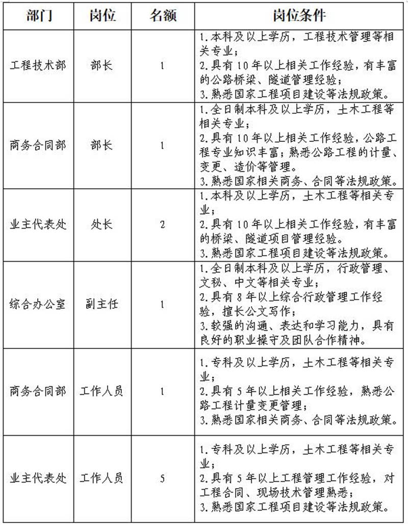 根據(jù)發(fā)展需要,決定面向社會公開招聘雅安市交通建設(shè)(集團(tuán))有限責(zé)任公司(以下簡稱“雅安交建集團(tuán)”)所屬子公司管理人員及工作人員共計11名,現(xiàn)將有關(guān)事項公告如下: