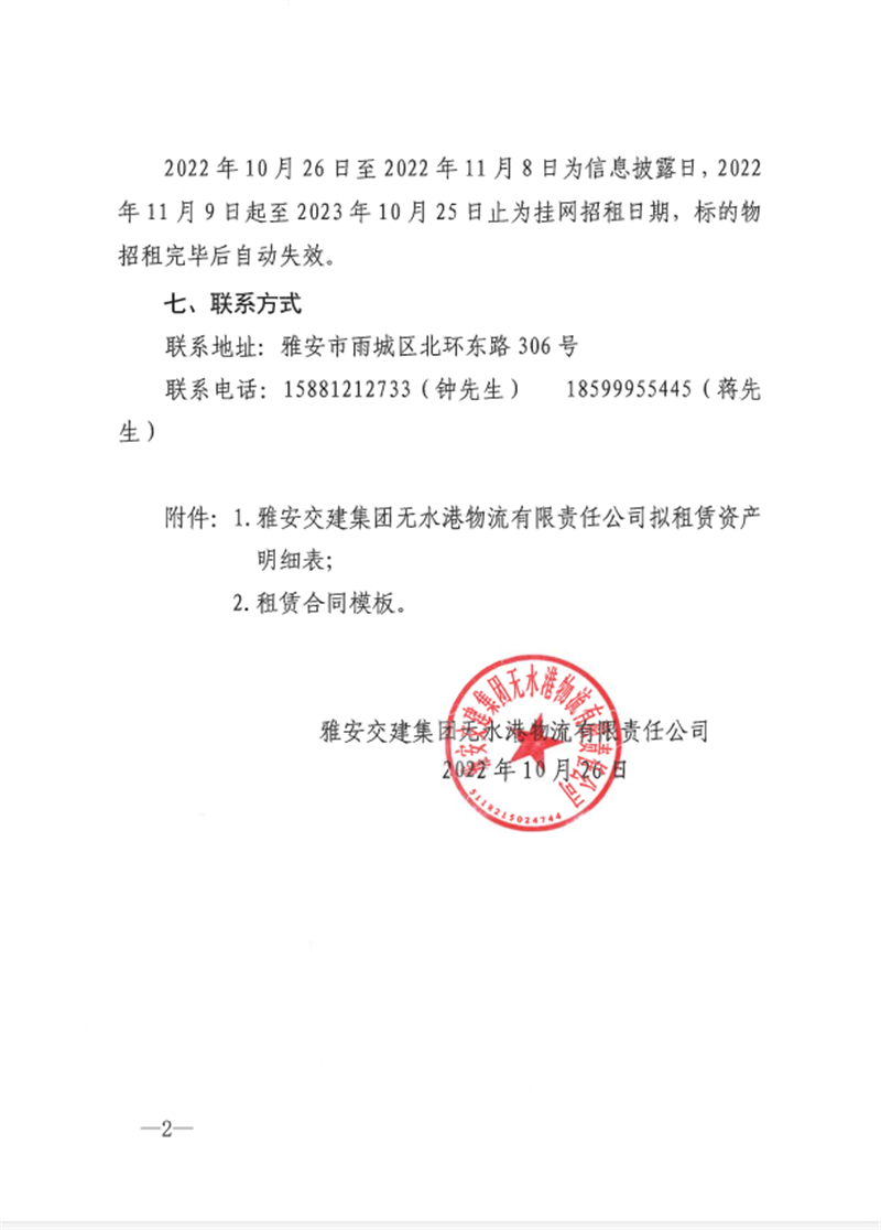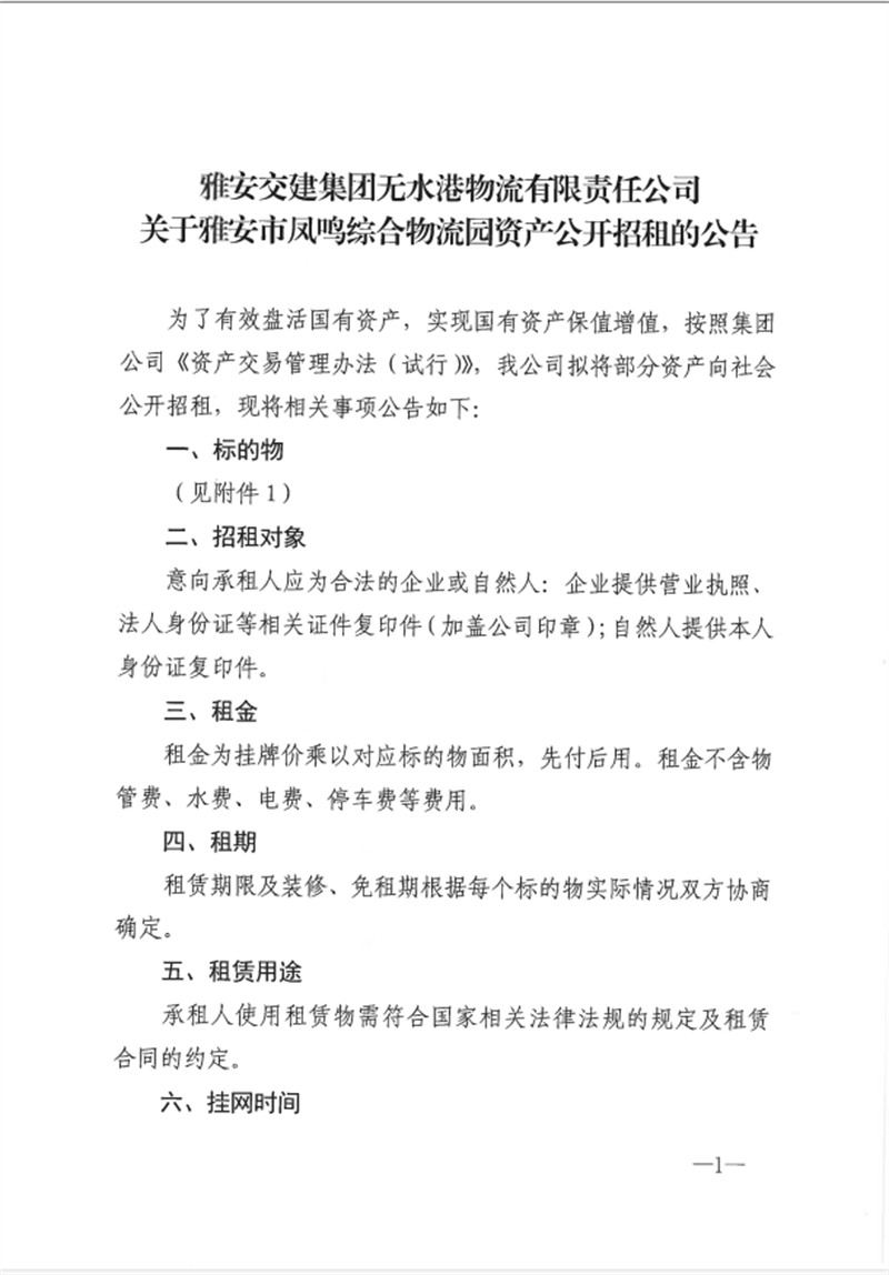 雅安交建集團無水港物流有限責任公司關于雅安市鳳鳴綜合物流園資產(chǎn)公開招租的公告