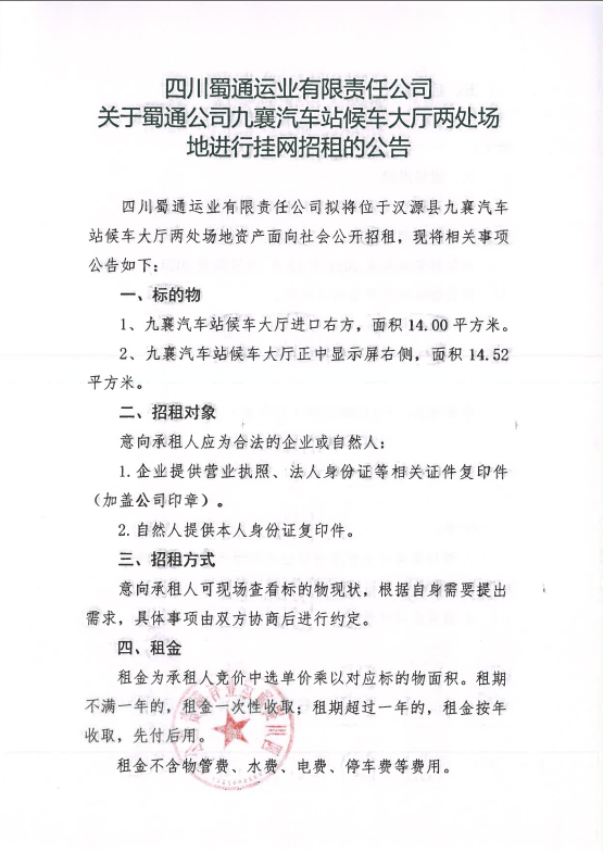 四川蜀通運業(yè)有限責任公司關(guān)于蜀通公司九襄汽車站候車大廳兩處場地進行掛網(wǎng)招租的公告