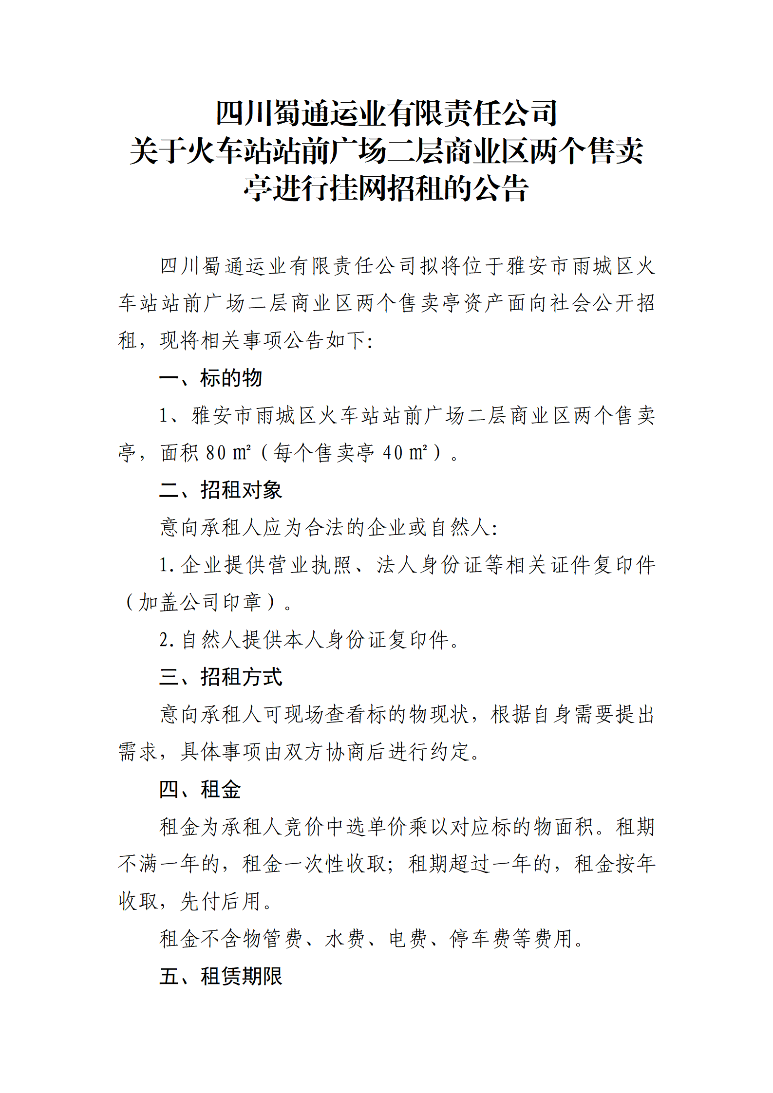 四川蜀通運(yùn)業(yè)有限責(zé)任公司關(guān)于火車站站前廣場(chǎng)二層商業(yè)區(qū)兩個(gè)售賣亭進(jìn)行掛網(wǎng)招租的公告