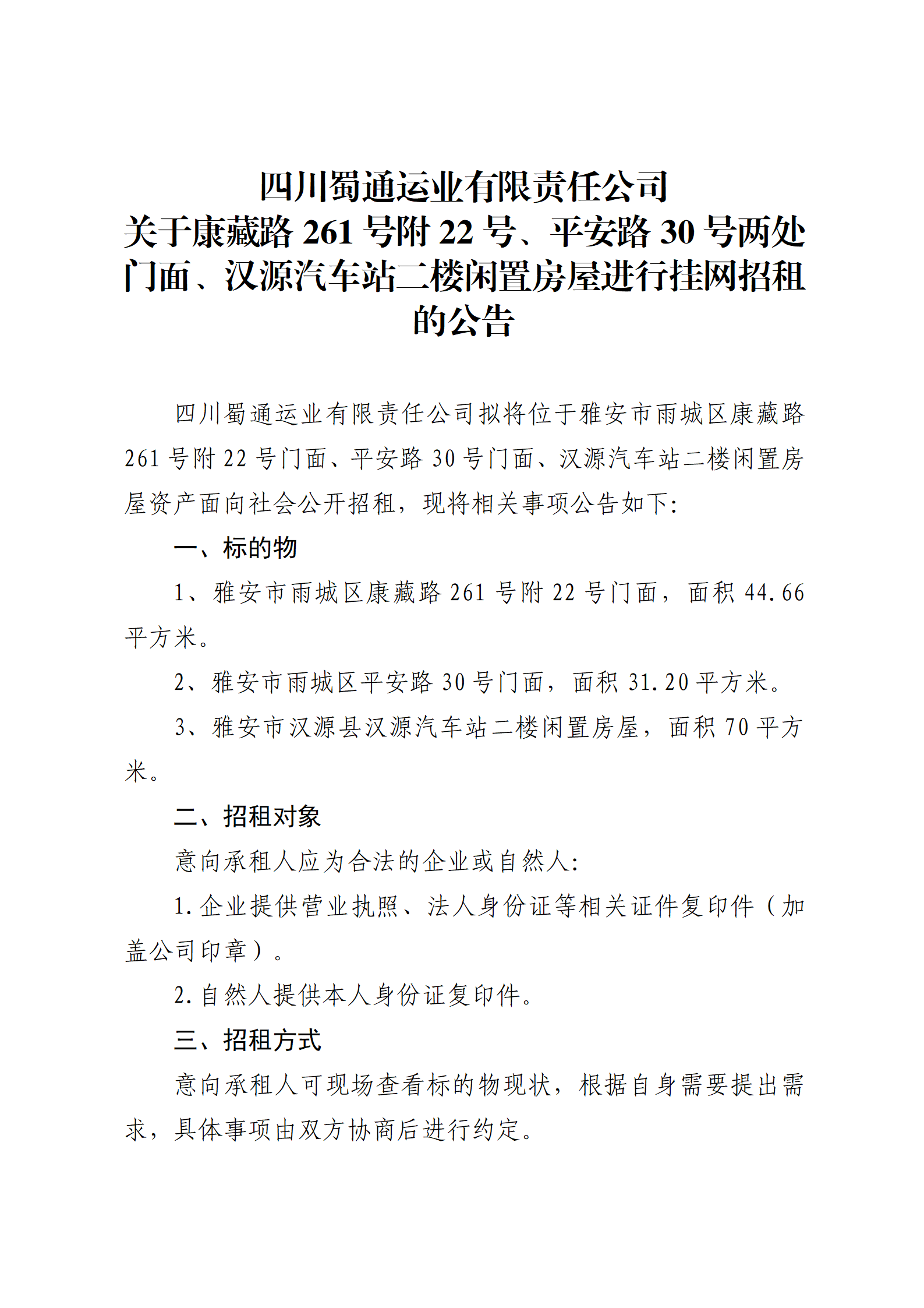 四川蜀通運(yùn)業(yè)有限責(zé)任公司 關(guān)于康藏路261號附22號、平安路30號兩處門面、漢源汽車站二樓閑置房屋進(jìn)行掛網(wǎng)招租的公告