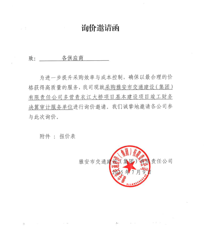 詢價邀請函——采購雅安市交通建設(shè)(集團)有限責任公司多營青衣江大橋項目基本建設(shè)項目竣工財務(wù)決算審計服務(wù)單位