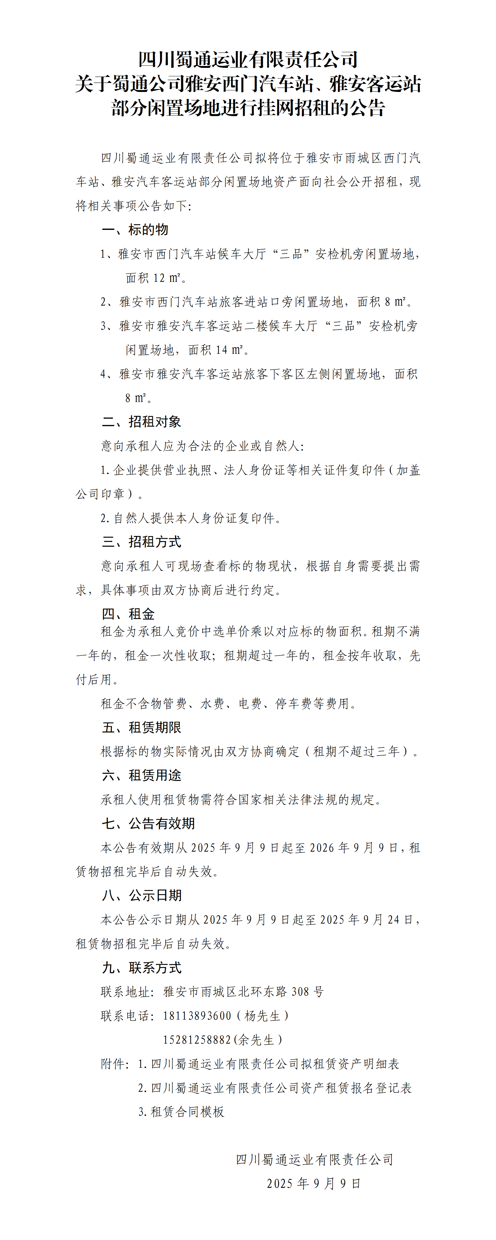 四川蜀通運(yùn)業(yè)有限責(zé)任公司 關(guān)于蜀通公司雅安西門汽車站、雅安客運(yùn)站部分閑置場地進(jìn)行掛網(wǎng)招租的公告