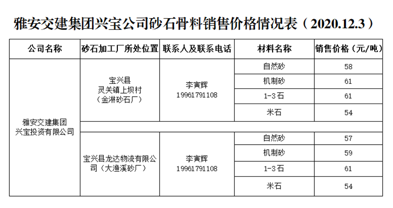 雅安交建集團(tuán)興寶公司砂石骨料銷售價(jià)格情況表(2020.12.3)