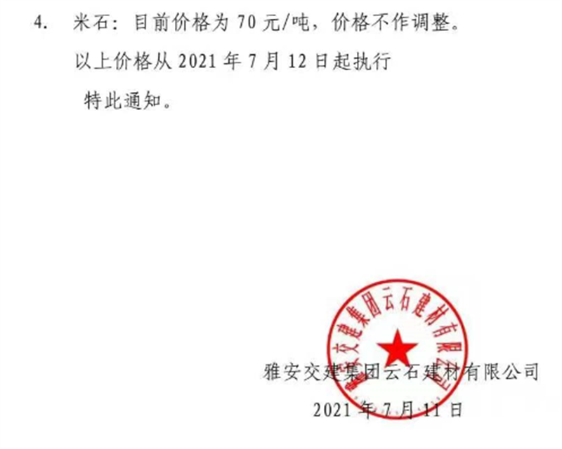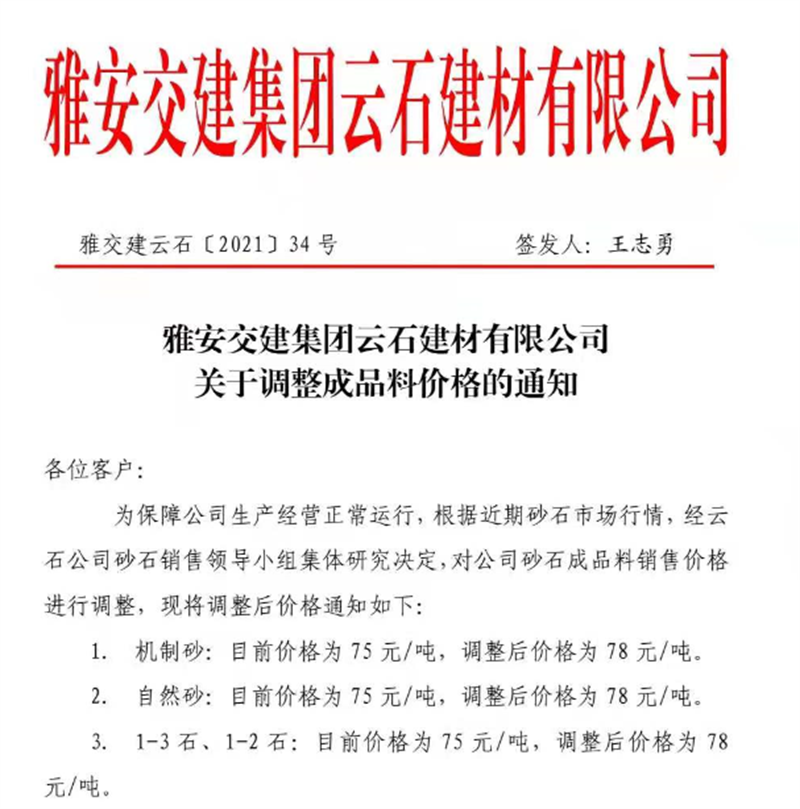 雅安交建集團(tuán)云石公司砂石骨料銷售價格情況表(2021.7.12)