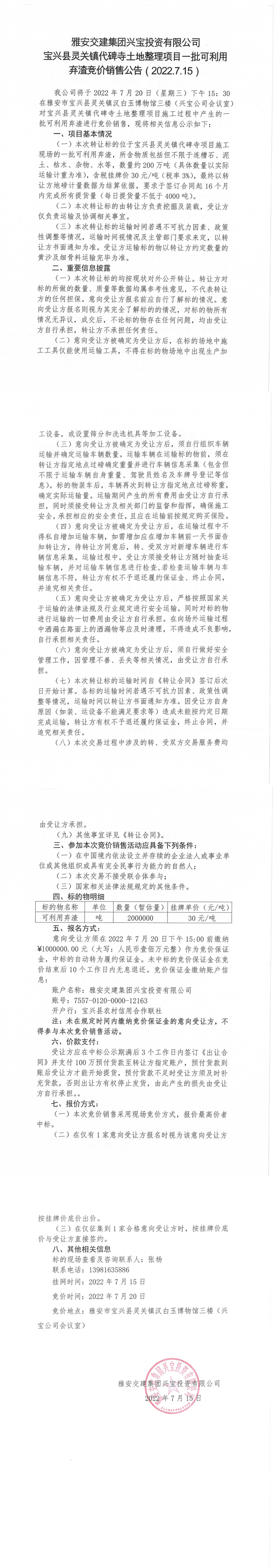 寶興縣靈關(guān)鎮(zhèn)代碑寺土地整理項(xiàng)目一批可利用棄渣競價(jià)銷售公告7.15(200萬噸)