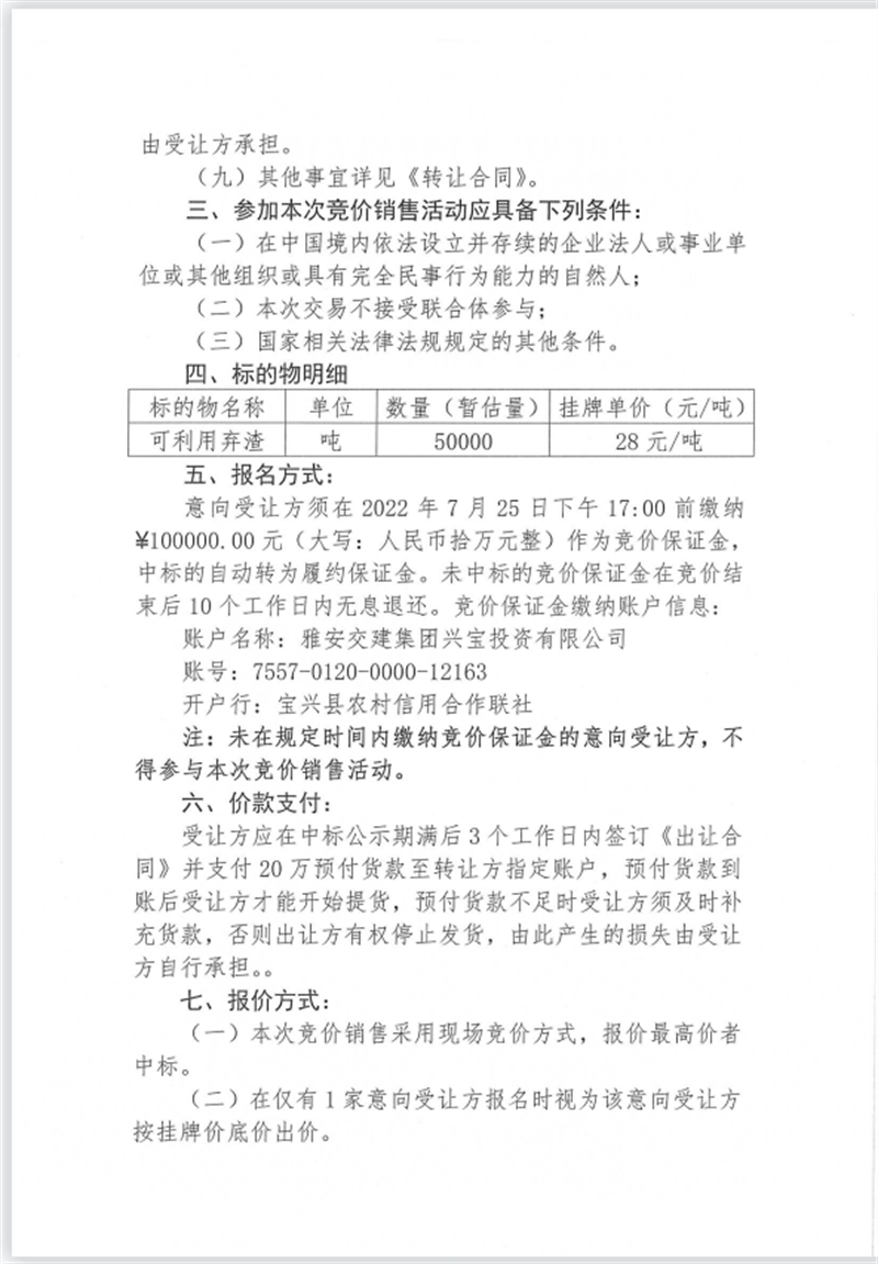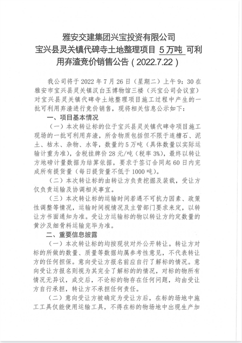 興寶公司寶興縣靈關(guān)鎮(zhèn)代碑寺土地整理項(xiàng)目10萬(wàn)噸可利用棄渣競(jìng)價(jià)銷售掛網(wǎng)公告掛網(wǎng)公告7.22(5萬(wàn)噸)