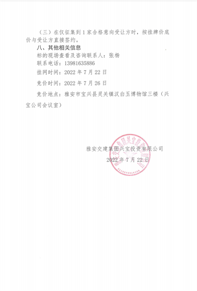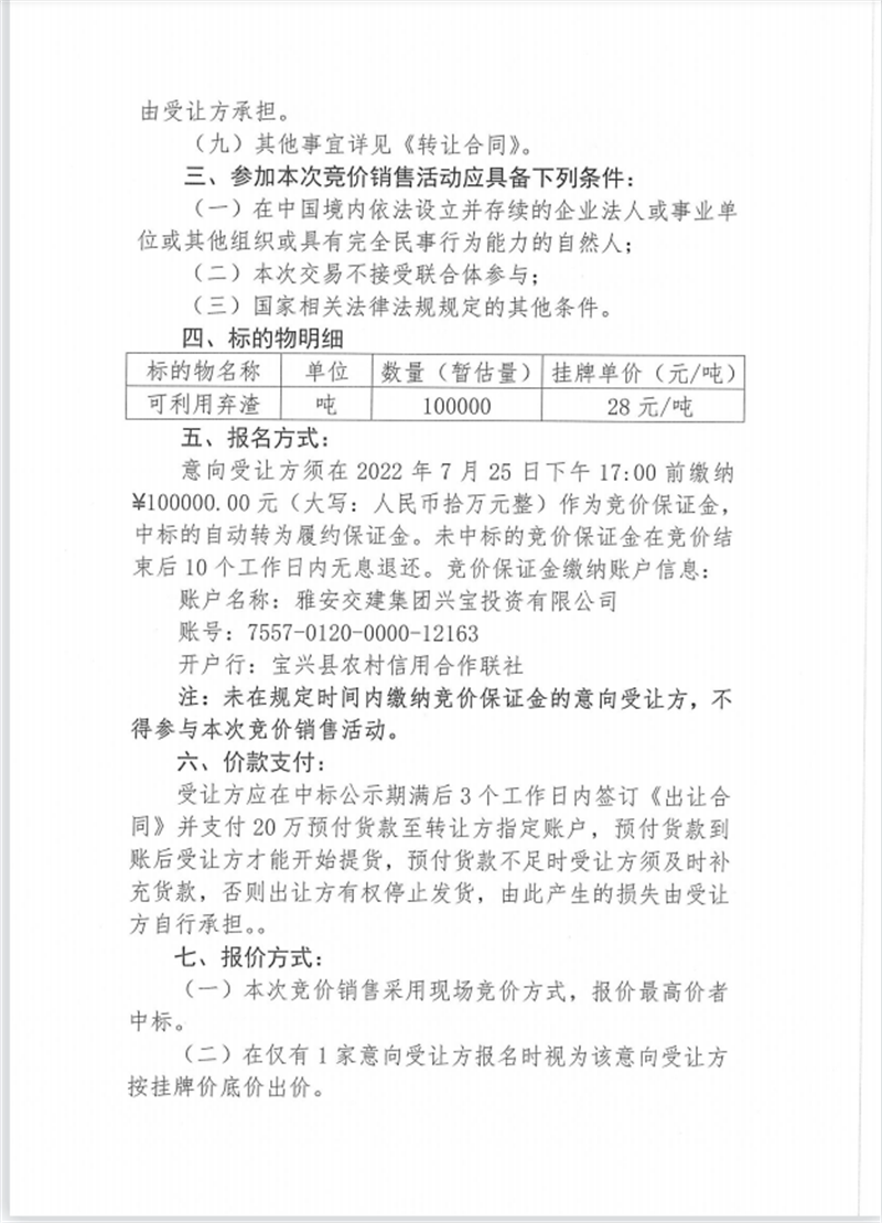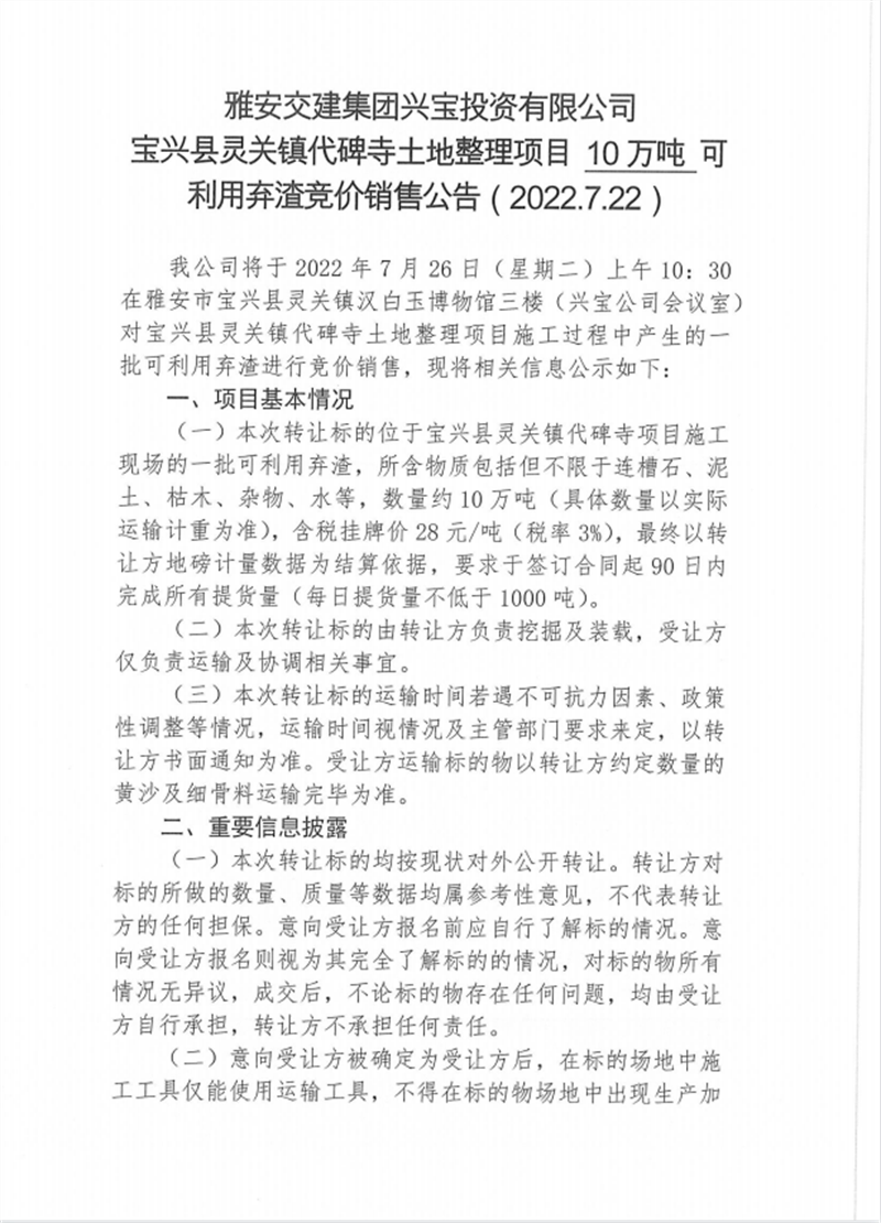 興寶公司寶興縣靈關(guān)鎮(zhèn)代碑寺土地整理項目10萬噸可利用棄渣競價銷售掛網(wǎng)公告7.22(10萬噸)