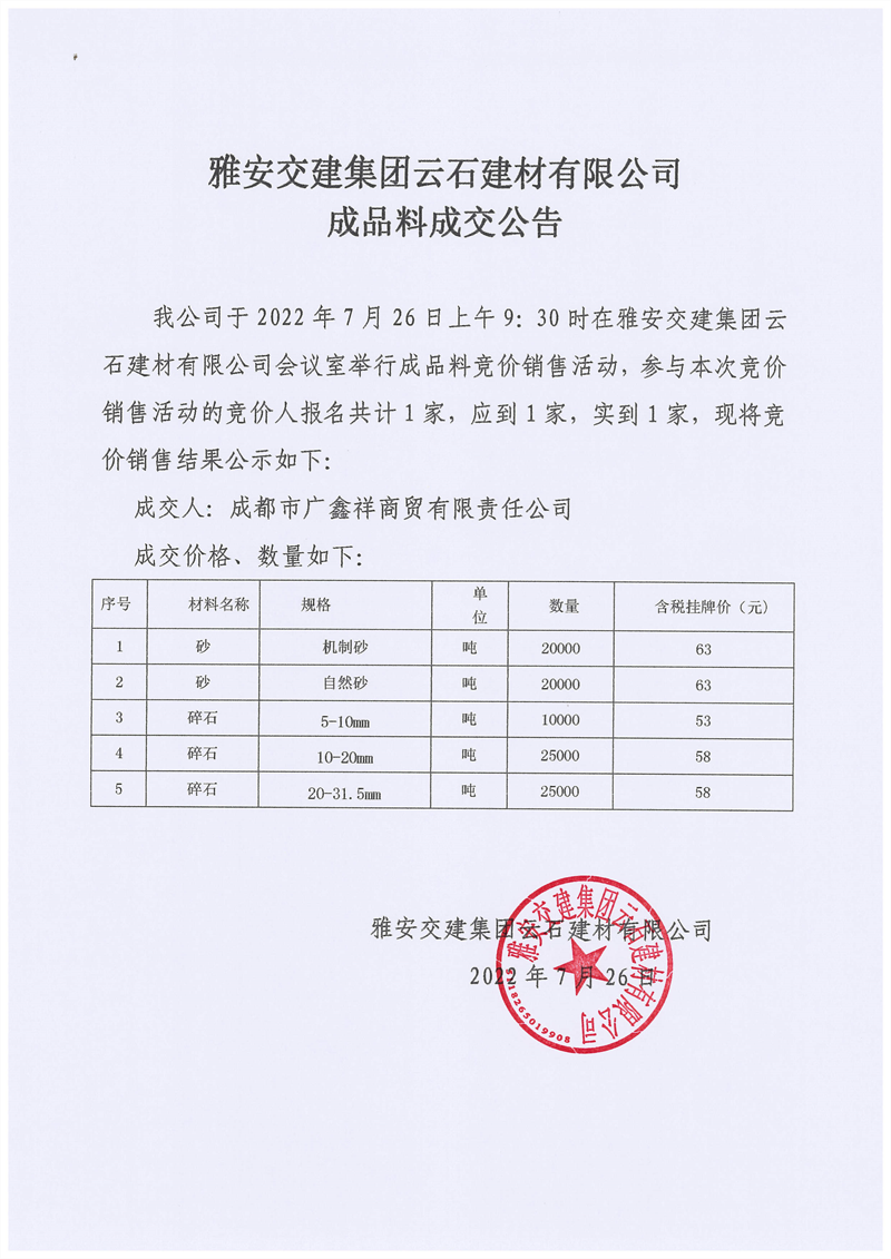雅安交建集團(tuán)云石建材有限公司成品料競價銷售成交公告7.26