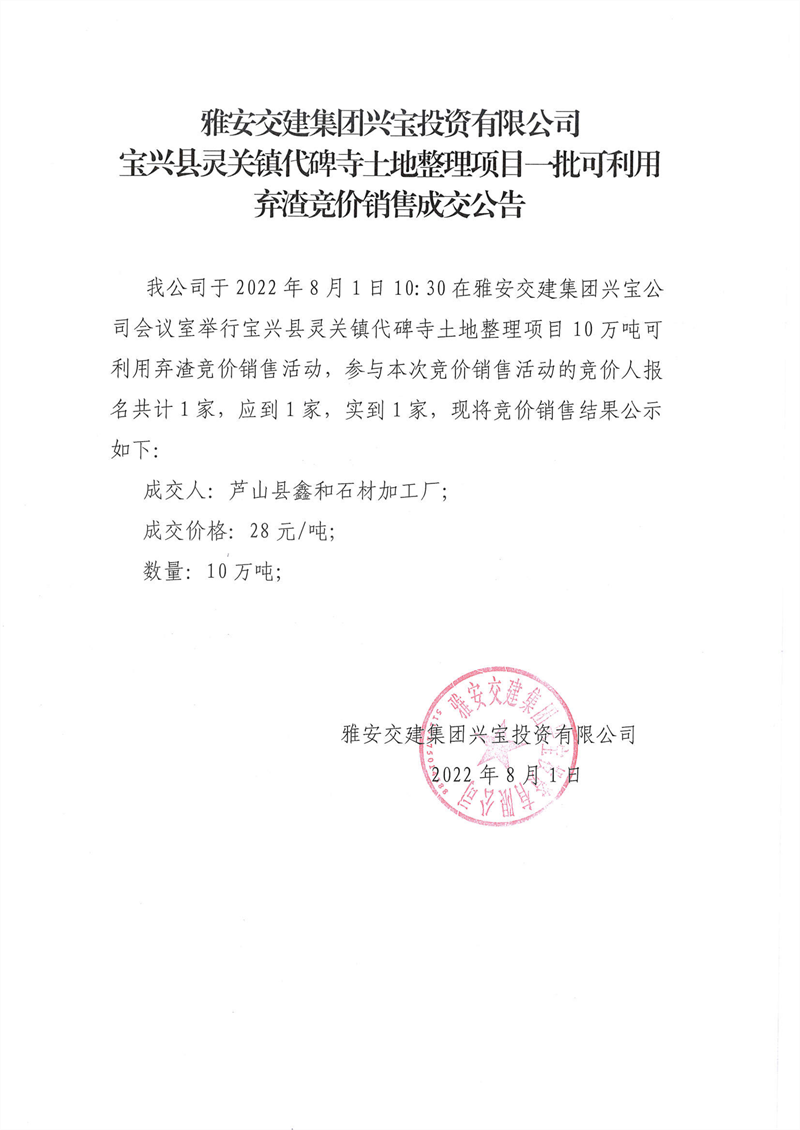 雅安交建集團興寶投資有限公司靈關(guān)鎮(zhèn)代碑寺土地整理項目5萬噸可利用棄渣競價銷售成交公告(2022.8.1)