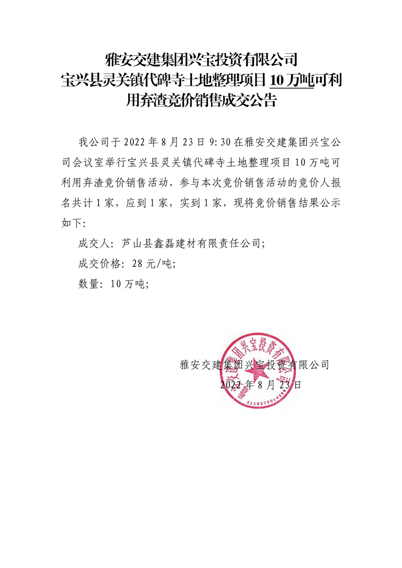 雅安交建集團(tuán)興寶投資有限公司寶興縣靈關(guān)鎮(zhèn)代碑寺土地整理項目10萬噸可利用棄渣競價銷售成交公告(8.23)