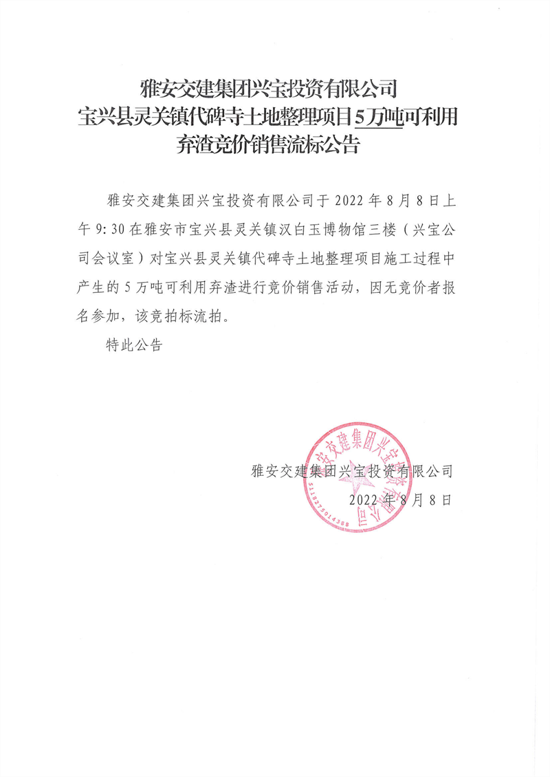 代碑寺土地整理項目5萬噸可利用棄渣競價銷售流標(biāo)公告