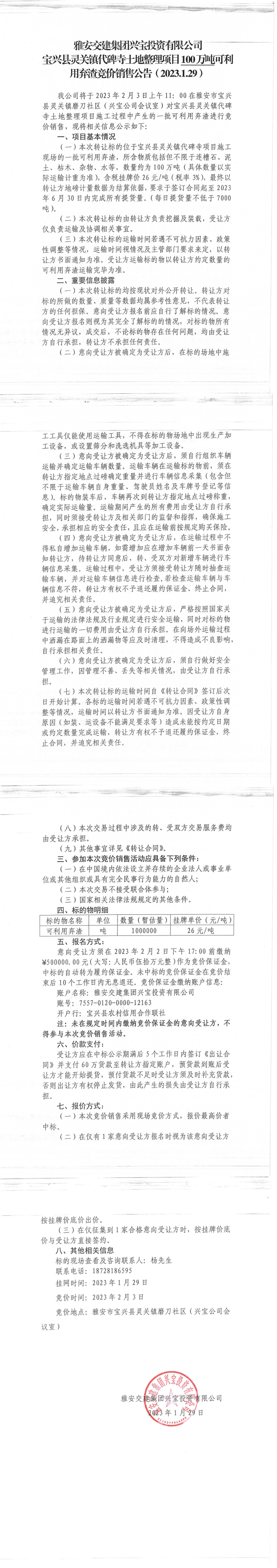 雅安交建集團(tuán)興寶投資有限公司靈關(guān)鎮(zhèn)代碑寺土地整理項(xiàng)目100萬(wàn)噸可利用棄渣競(jìng)價(jià)銷(xiāo)售公告(2023.1.29)