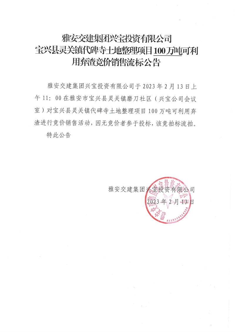 雅安交建集團(tuán)興寶投資有限公司100萬噸可利用棄渣競價銷售流標(biāo)公告(2023.2.13)