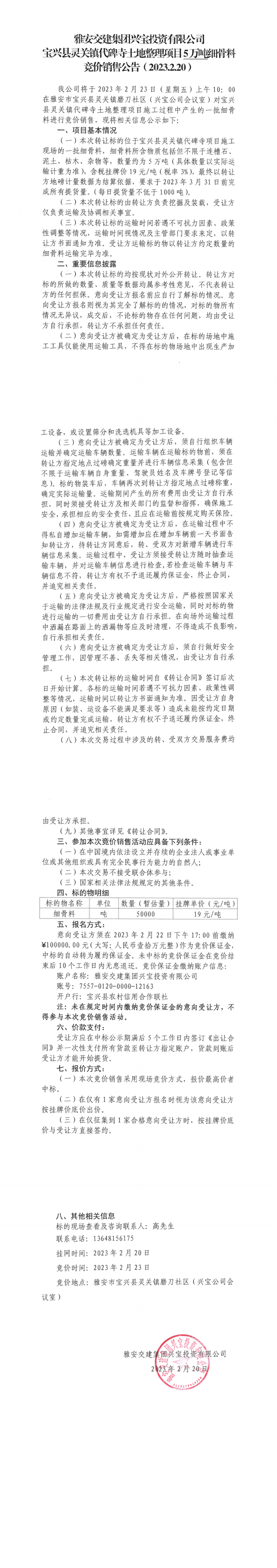 雅安交建集團興寶投資有限公司寶興縣靈關鎮(zhèn)代碑寺土地整理項目5萬噸細骨料競價銷售公告(2023.2.20)