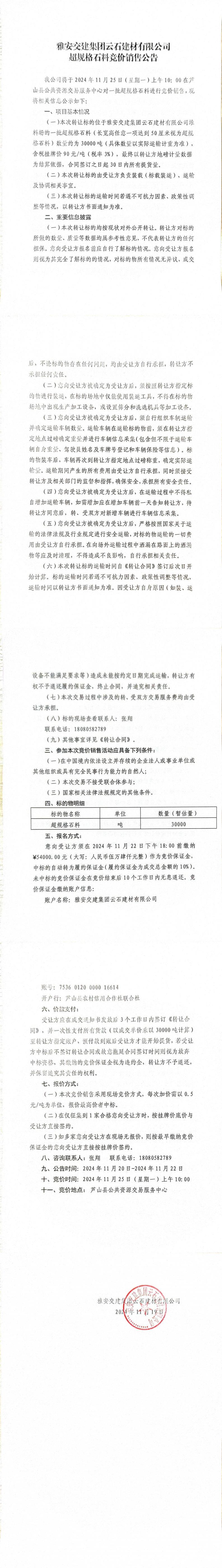 雅安交建集團(tuán)云石建材有限公司超規(guī)格石料競(jìng)價(jià)銷售公告(2024-11-19)