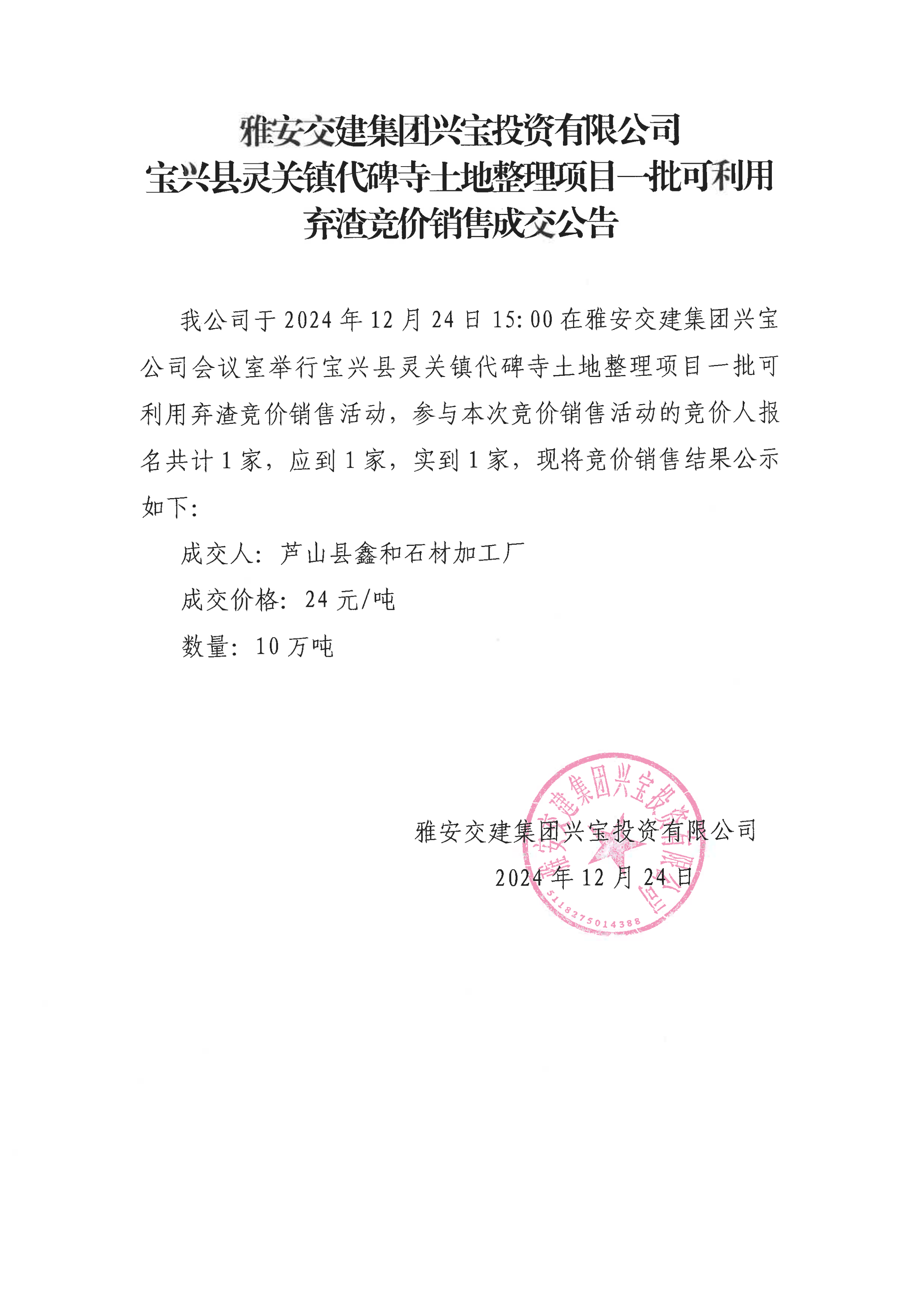 雅安交建集團(tuán)興寶投資有限公司靈關(guān)鎮(zhèn)代碑寺土地整理項(xiàng)目10萬(wàn)噸可利用棄渣成交公告(2024.12.24)