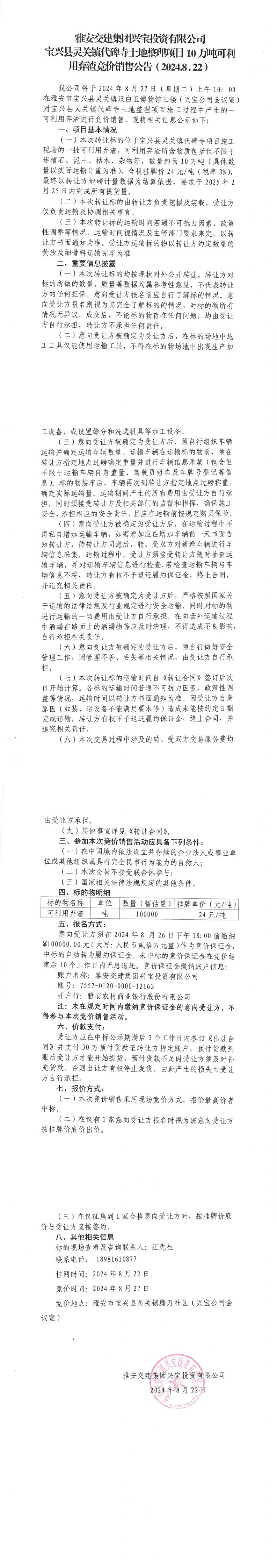 雅安交建集團(tuán)興寶投資有限公司寶興縣靈關(guān)鎮(zhèn)代碑寺土地整理項(xiàng)目10萬噸可利用棄渣競價(jià)銷售公告(2024-8-22)_0