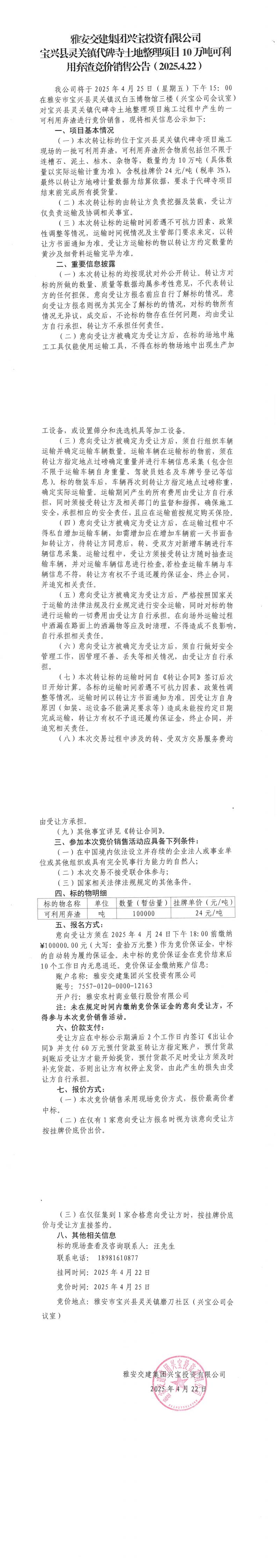 雅安交建集團(tuán)興寶投資有限公司寶興縣靈關(guān)鎮(zhèn)代碑寺土地整理項(xiàng)目10萬(wàn)噸可利用棄渣競(jìng)價(jià)銷(xiāo)售公告