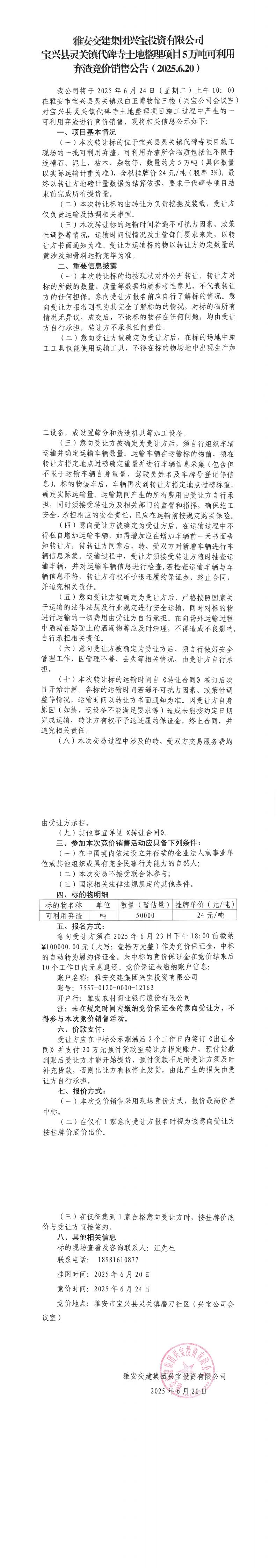 雅安交建集團(tuán)興寶投資有限公司寶興縣靈關(guān)鎮(zhèn)代碑寺土地整理項(xiàng)目5萬(wàn)噸可利用棄渣競(jìng)價(jià)銷售公告