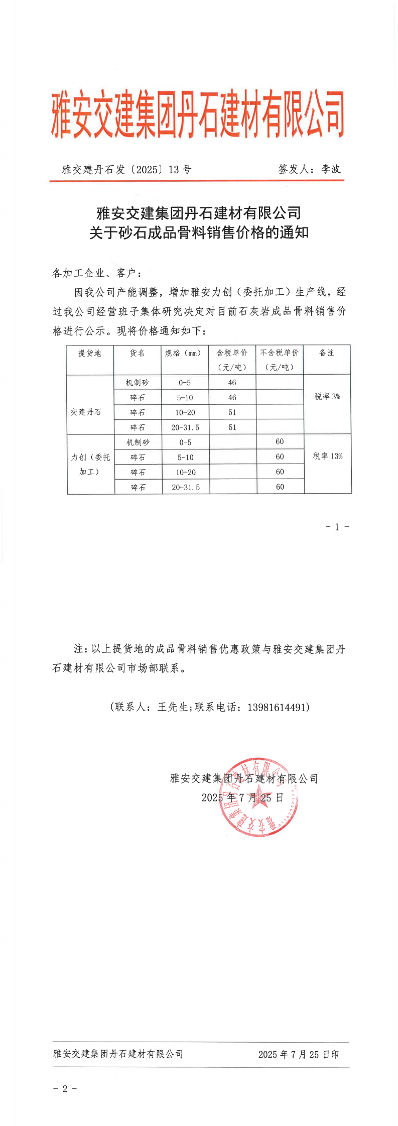 雅安交建集團(tuán)丹石建材有限公司關(guān)于調(diào)整砂石成品骨料價(jià)格的通知(2025.7.28)